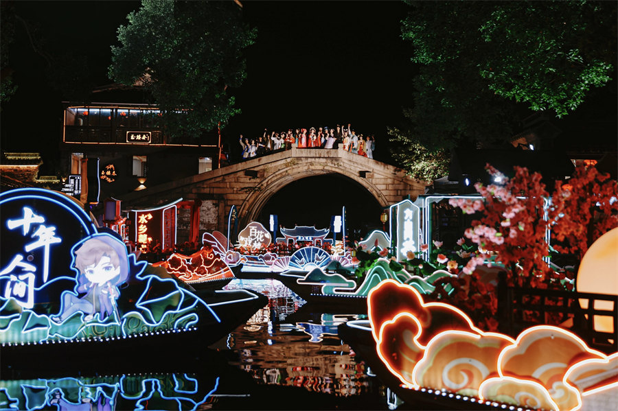 With six elaborately decorated flower boats gliding gently along the town's scenic Xutang River, the night parade brought a poetic and immersive experience to life, blending Jiangnan's watery charm with rich theatrical traditions.