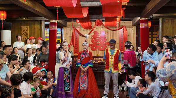 Tourists experience the She ethnic wedding custom in Jingning She autonomous county. [Photo/Tide News]